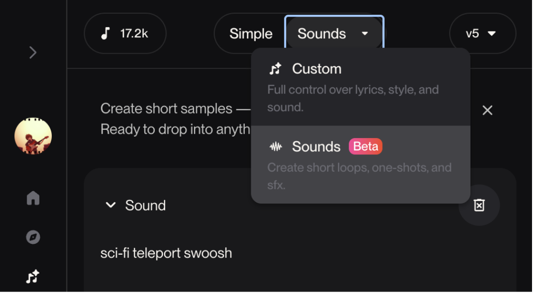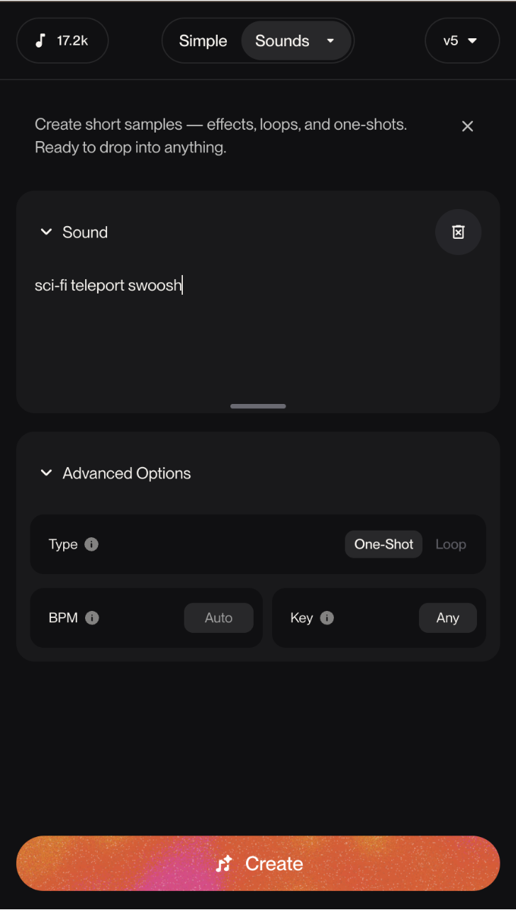 Suno Sounds is a new, experimental feature that allows you to generate individual sound effects, instrument samples, ambient noises, and more. Using simple text prompts, you can create custom audio clips for music production, video content, game design, or any creative project. This tool is in beta, offering powerful possibilities while still being refined for accuracy.